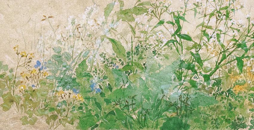 万娟目光仔细扫过那些看似相近的草叶。她很快发现,绿意里藏着不少细微差异:贴地生长的车前草叶片泛着浅绿,旁边的苦荬菜带着墨绿底色,几株狗尾草的边缘还晕着淡淡的赭石。动笔时,她先勾出叶片轮廓,趁花青与藤黄调和的颜料没干,迅速蘸少量赭石点在边缘褶皱处,墨色顺着水分晕开,叶片立刻有了被午后微风吹过的起伏感。