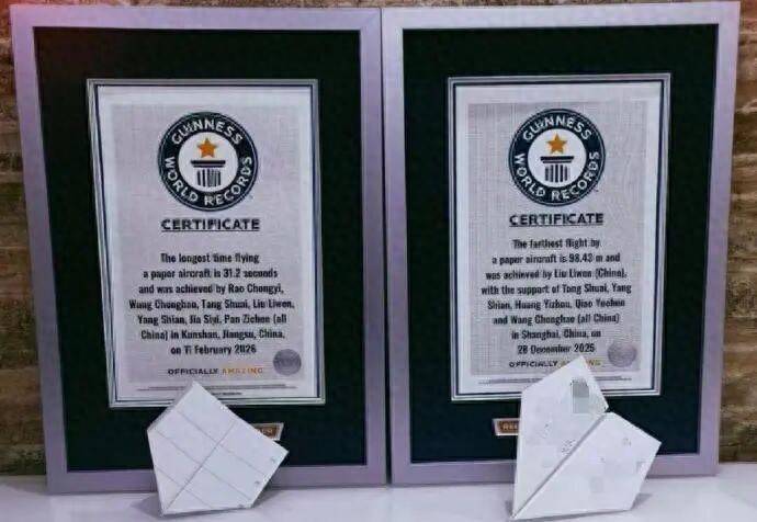 一架纸飞机在空中划出轻盈弧线,秒表最终定格在31.2秒……近日,吉尼斯世界纪录正式确认,来自中国的饶翀逸、王承昊、唐帅、刘力文、杨仕安、贾思熠、潘秭辰7人团队刷新了“纸飞机飞行时间最长”纪录。3月26日,红星新闻记者从吉尼斯世界纪录获悉,该项纪录此前由日本挑战者户田拓夫于2010年12月创造,成绩为29.2秒。这次中国的7名青年团队,凭借纸飞机31.2秒的空中滞空时长,将该项尘封15年的纪录提升整整2秒。
