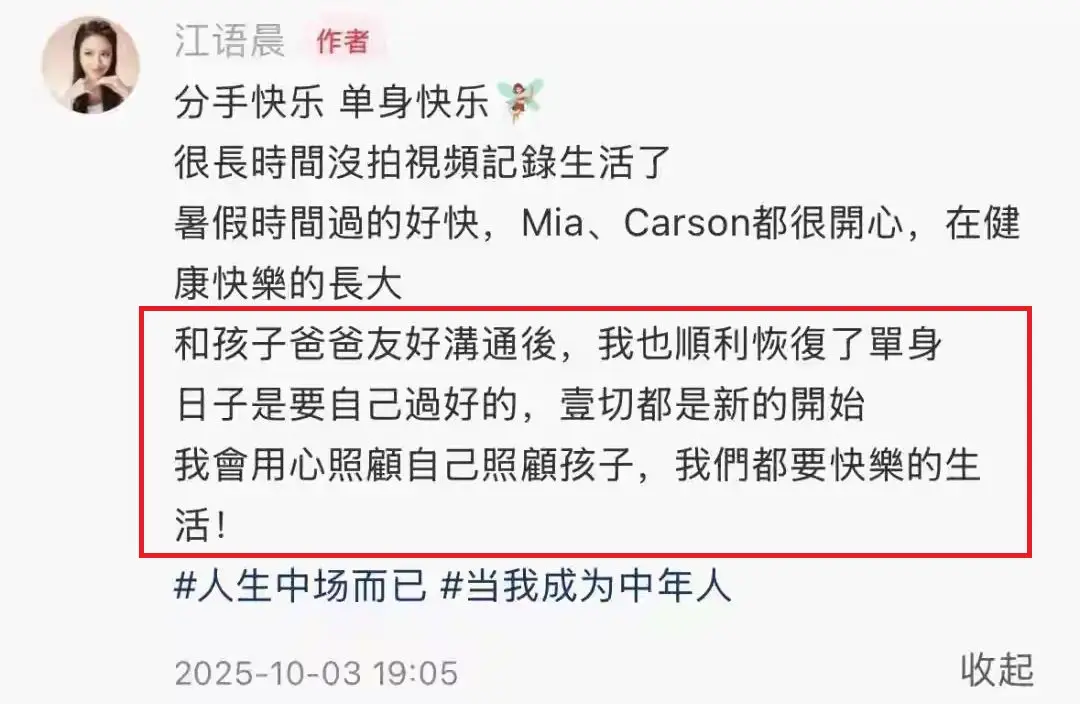 直到2025年10月,江语晨忽然宣布了回归单身的消息,并透露孩子的父亲因为工作原因常年不在家,两个孩子都是自己照顾,以一句“分开后还是好朋友”为这段婚姻画上了句号。